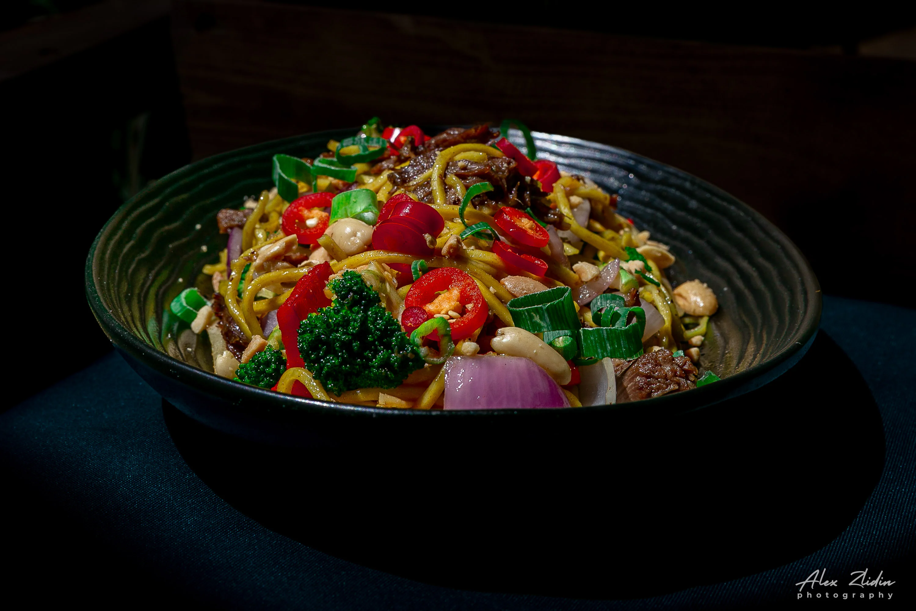 שליטה באור טבעי ותאורה מבוקרת לשמירת צבע אותנטי, ברק רטבים ושקיפות כוסות יין וקרח.