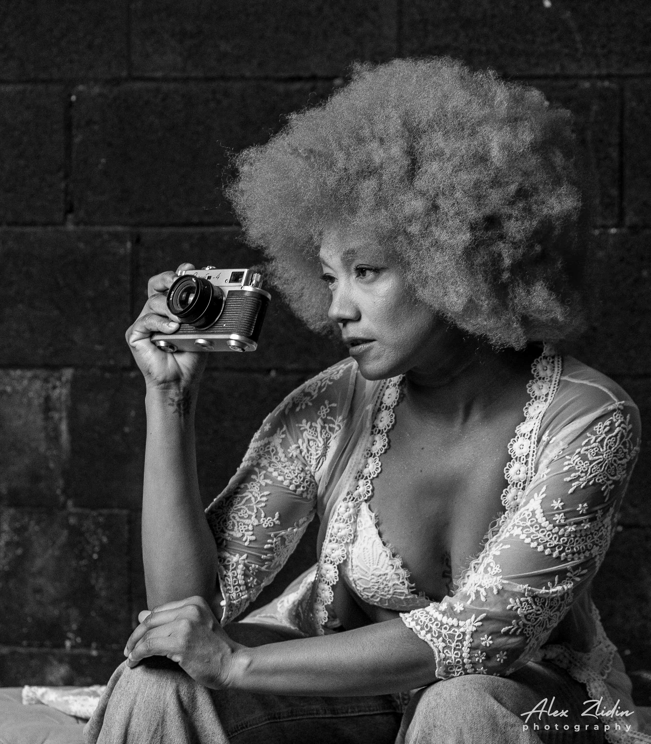 דוגמנית עם מצלמת ווינטאגי שחור לבן.jpg