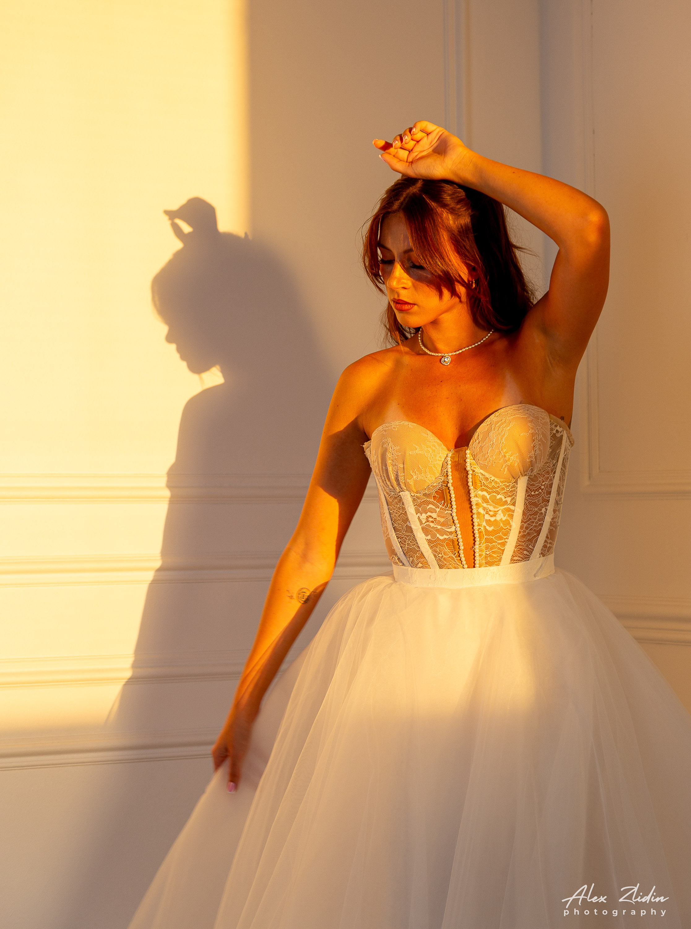 שמלת כלה באור שקיעה וצל על הקיר.jpg